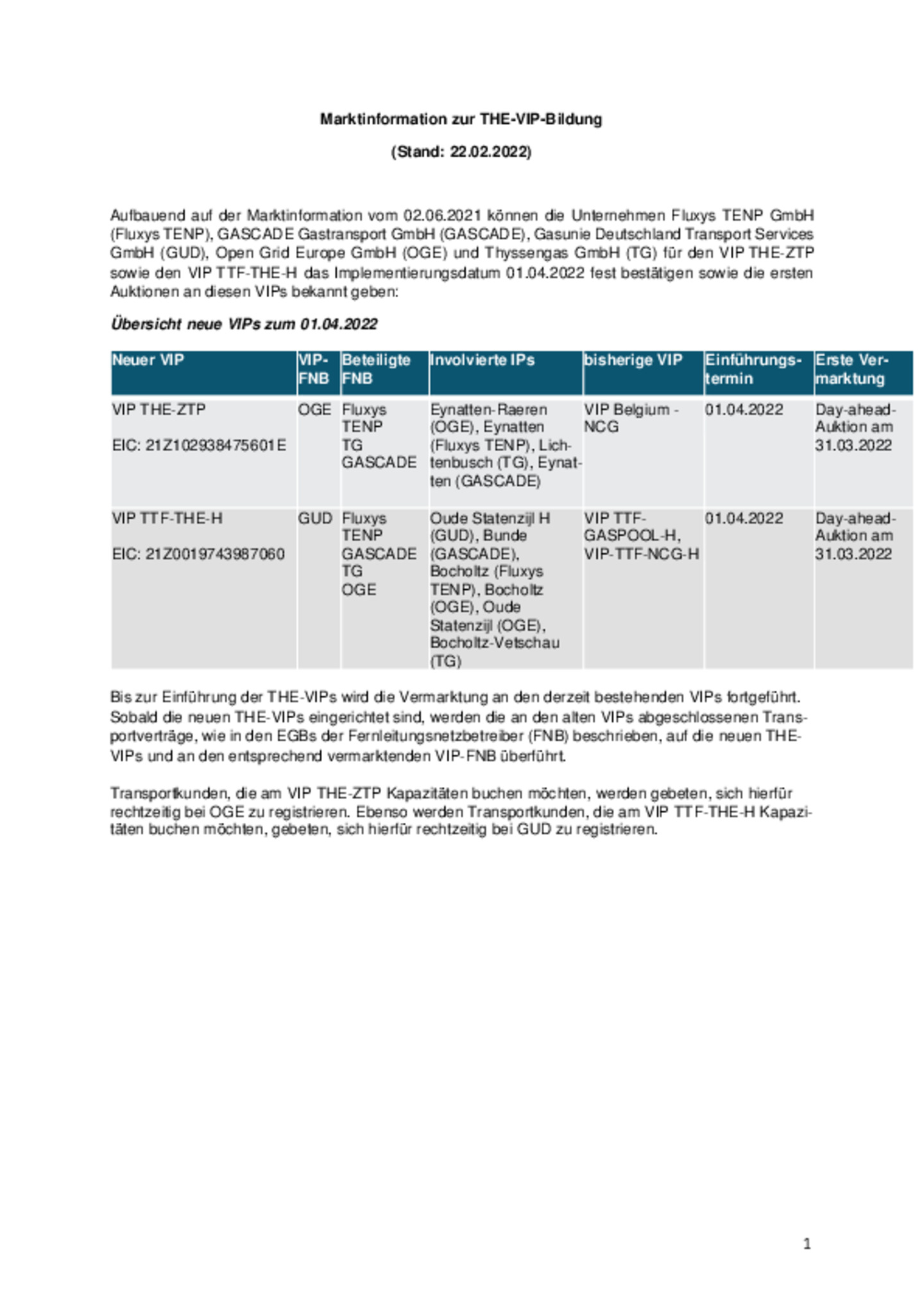 Aufbauend auf der Marktinformation vom 02.06.2021 können die Unternehmen Fluxys TENP GmbH (Fluxys TENP), GASCADE Gastransport GmbH (GASCADE), Gasunie Deutschland Transport Services GmbH (GUD), Open Grid Europe GmbH (OGE) und Thyssengas GmbH (TG) für den VIP THE-ZTP sowie den VIP TTF-THE-H das Implementierungsdatum 01.04.2022 fest bestätigen sowie die ersten Auktionen an diesen VIPs bekannt geben:| Neuer VIP | VIP-FNB | beteiligte FNB | involvierte IPs | alte VIPs | Einführungstermin | Erste Vermarktung |