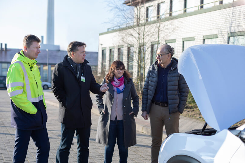 Kurz vor der Abfahrt kommt Projektleiter Martin Frings zum Fahrzeug. Mahsa Siebold, die einmal die Projektleitung für die technische Umsetzung von Westküste 100 übernehmen wird und ihr Kollege aus der Projektkommunikation Andreas Lehmann wollen noch nicht einsteigen. Gemeinsam schauen die Fachleute unter die Motorhaube. Wo ist die Brennstoffzelle? Wo ist der Tank?