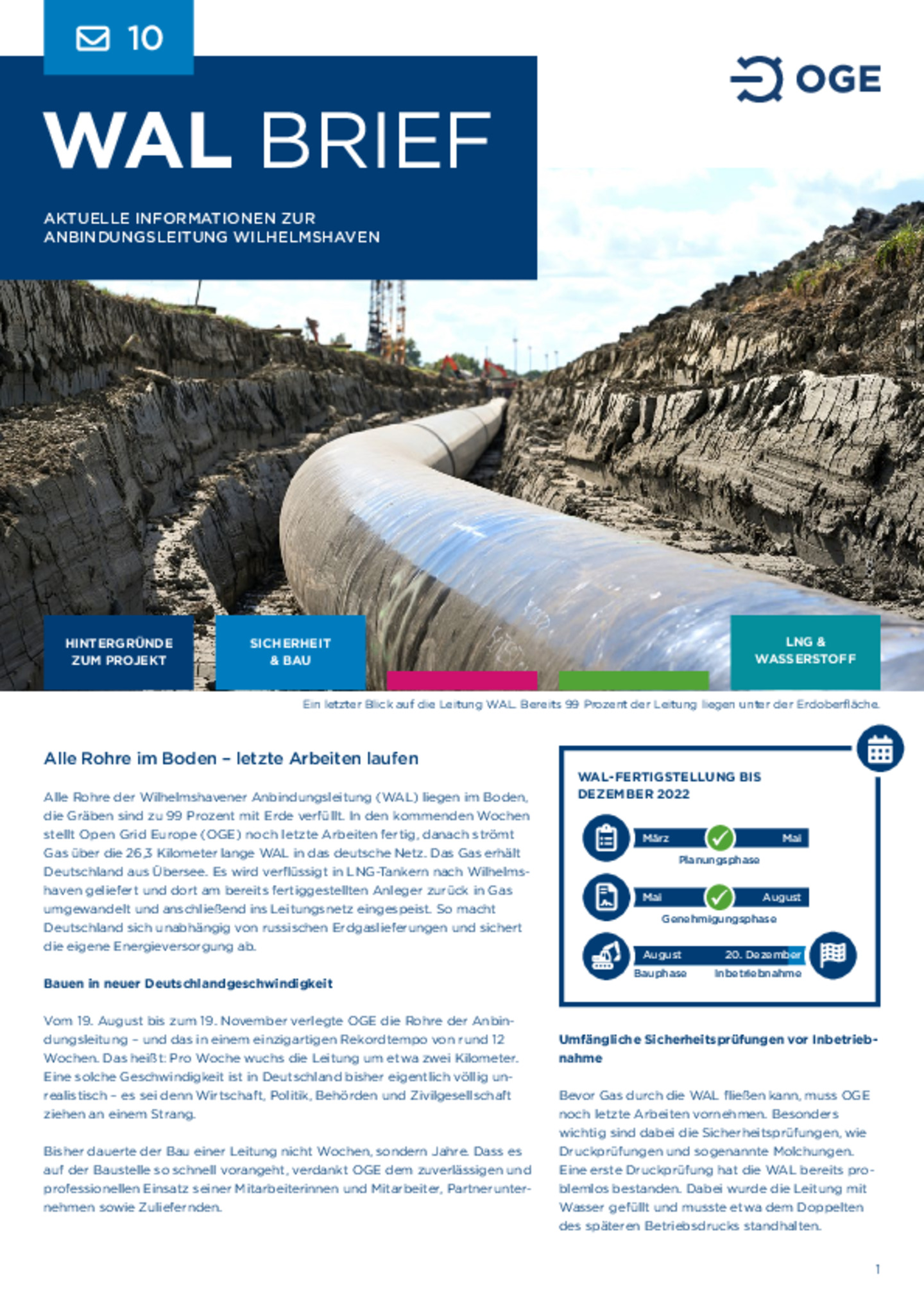 Zuverlässige und sichere Fertigstellung der WAL in Rekordgeschwindigkeit. WAL transportiert LNG aus Wilhelmshaven in das deutsche Ferngasnetz und trägt zur deutschen Energieversorgung bei. Leitung …ist H2-ready und ein wichtiger Eckpfeiler für die künftige Wasserstoffwirtschaft in Deutschland