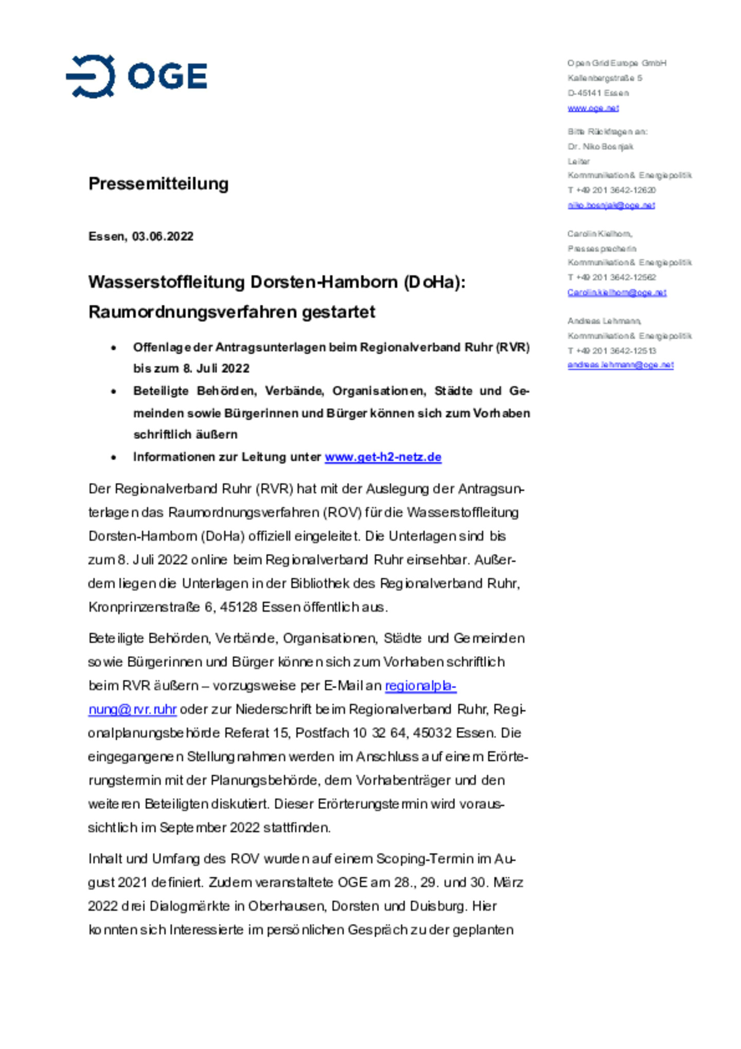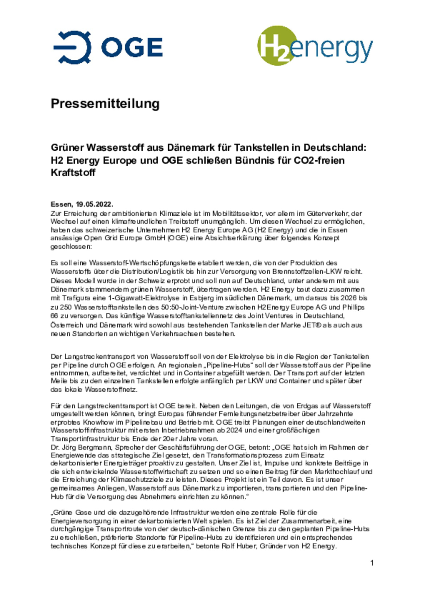 Essen, 19.05.2022. Zur Erreichung der ambitionierten Klimaziele ist im Mobilitätssektor, vor allem im Güterverkehr, der Wechsel auf einen klimafreundlichen Treibstoff unumgänglich. Um diesen Wechsel …zu ermöglichen, haben das schweizerische Unternehmen H2 Energy Europe AG (H2 Energy) und die in Essen ansässige Open Grid Europe GmbH (OGE) eine Absichtserklärung über folgendes Konzept geschlossen.