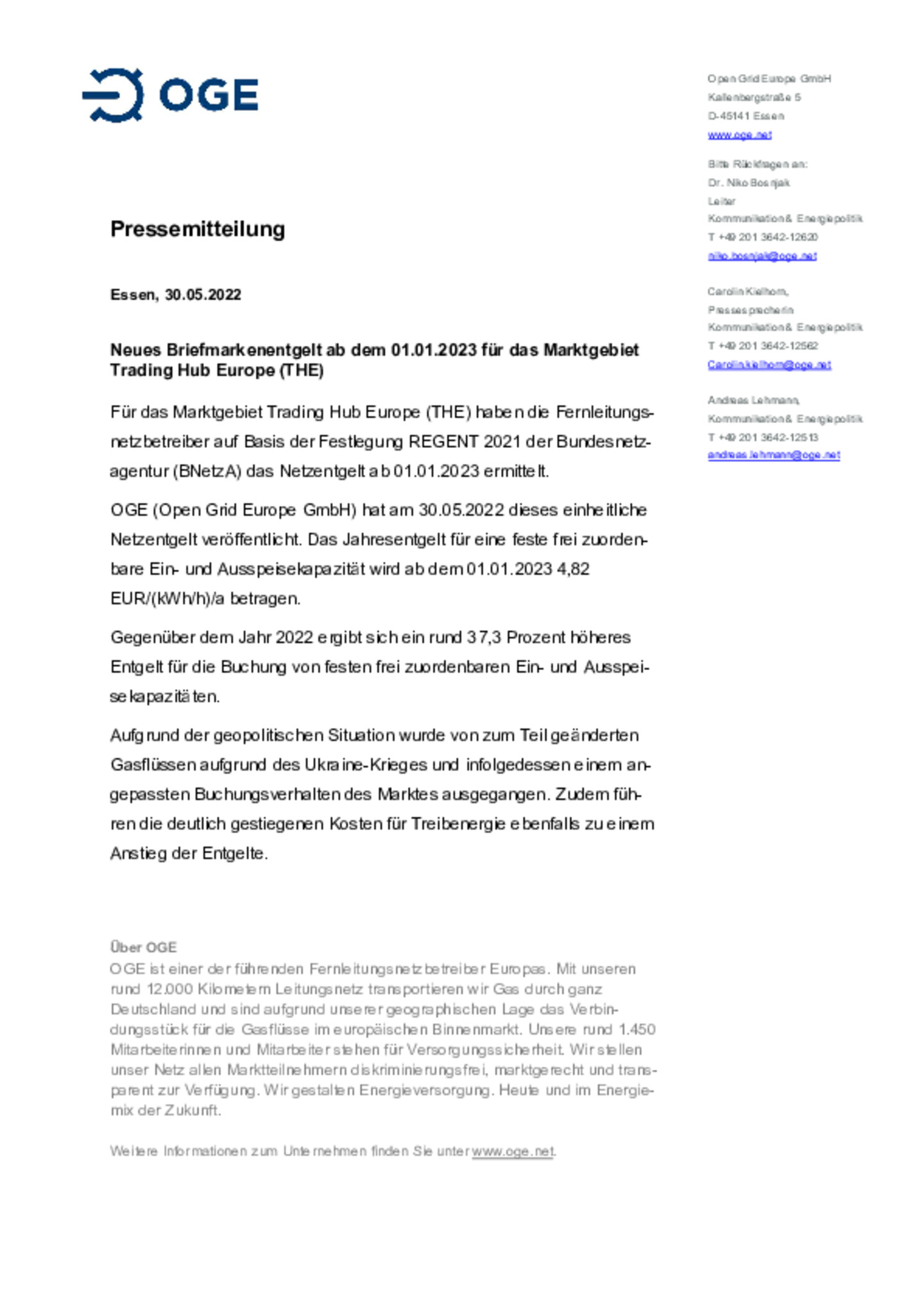 Für das Marktgebiet Trading Hub Europe (THE) haben die Fernleitungs-netzbetreiber auf Basis der Festlegung REGENT 2021 der Bundesnetza-gentur (BNetzA) das Netzentgelt ab 01.01.2023 ermittelt.