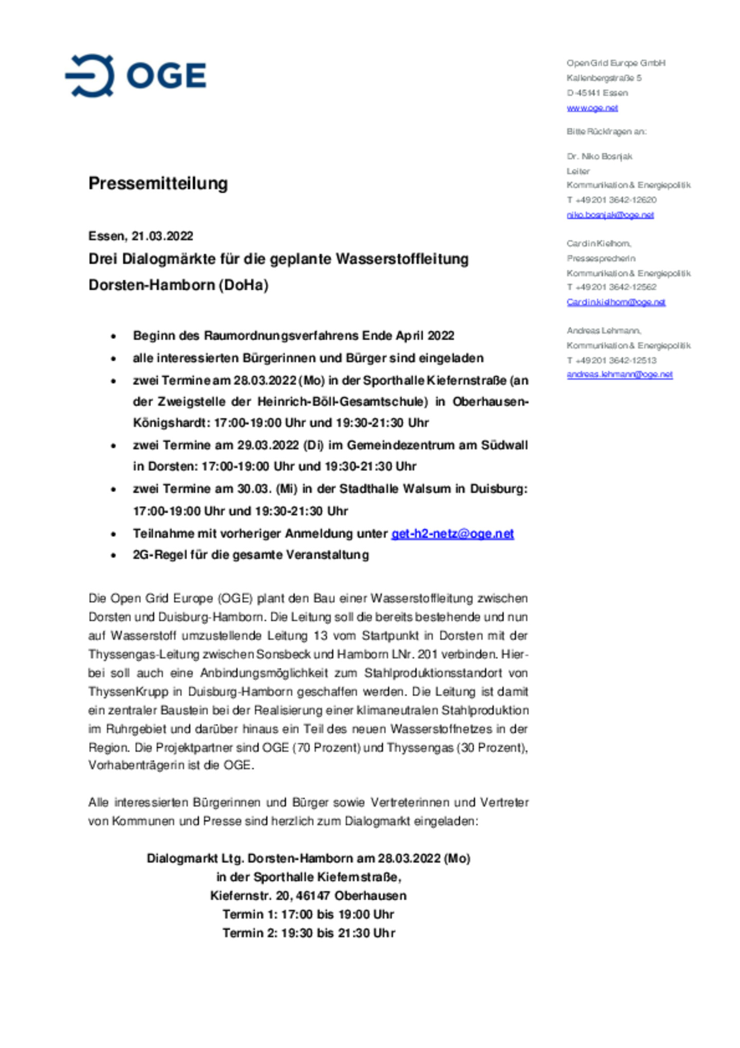 Der Landesumweltminister von Niedersachsen, Olaf Lies, übergab am 02.02.2022 auf dem Betriebsgelände der OGE in Krummhörn/Ostfriesland einen Förderbescheid über 2,81 Millionen Euro für das …Wasserstoff-Pilotprojekt „KRUH2“. Das Projekt soll zeigen, wie grüner Wasserstoff vor Ort erzeugt und gespeichert werden kann, um den Eigenbedarf einer Betriebsstelle an Wärme, Mobilität und Strom zu decken.
