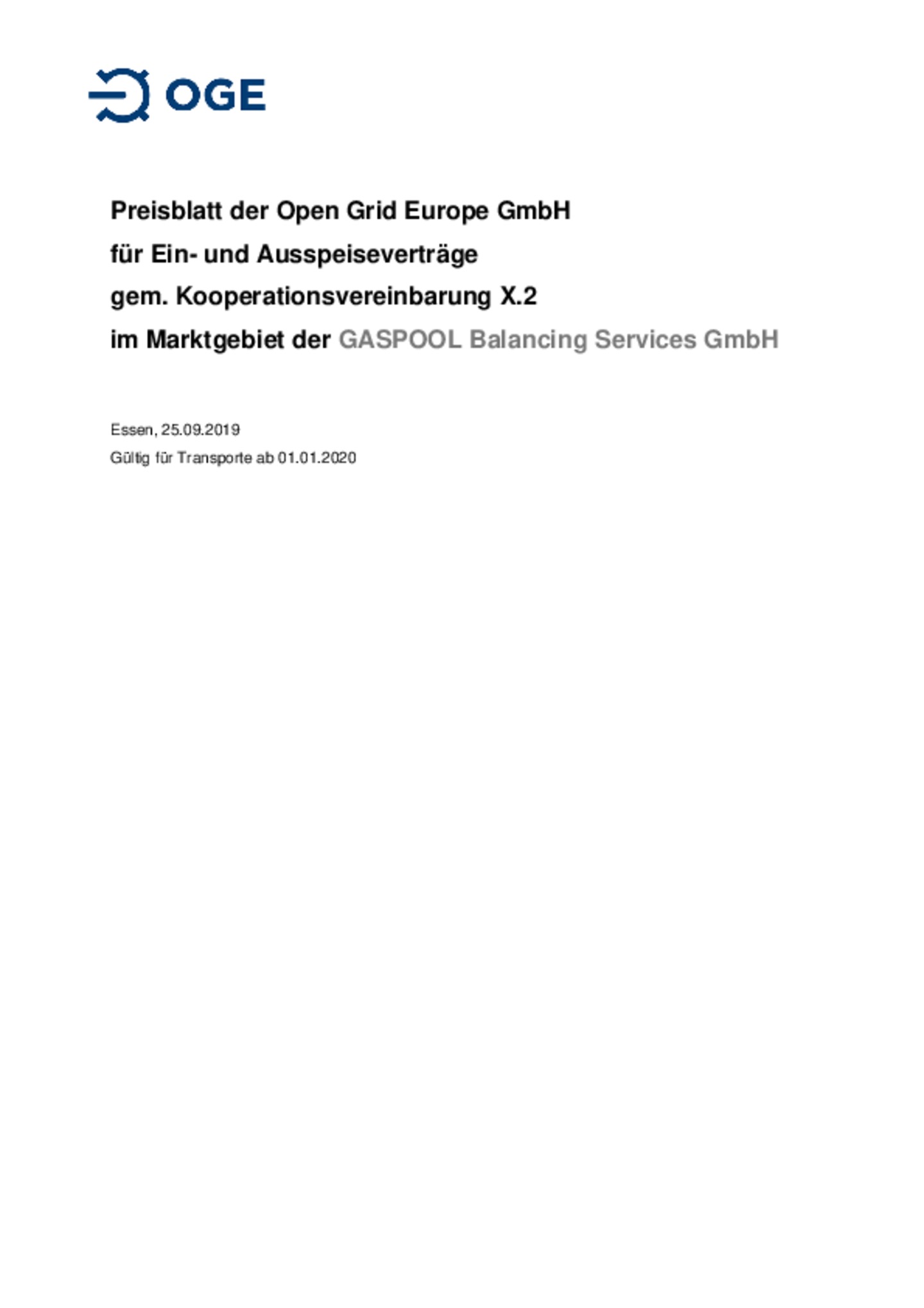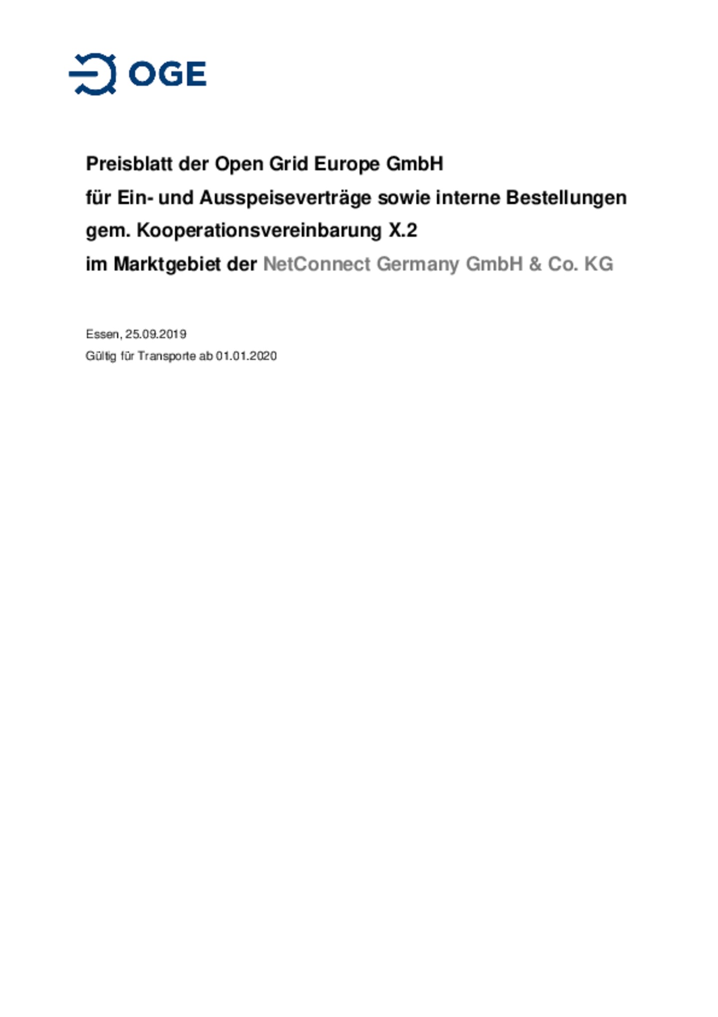 Preisblatt der Open Grid Europe GmbH für Ein- und Ausspeiseverträge sowie interne Bestellungen gem. Kooperationsvereinbarung XI im Marktgebiet NetConnect Germany GmbH & Co. KG bzw. Trading Hub Europe GmbH