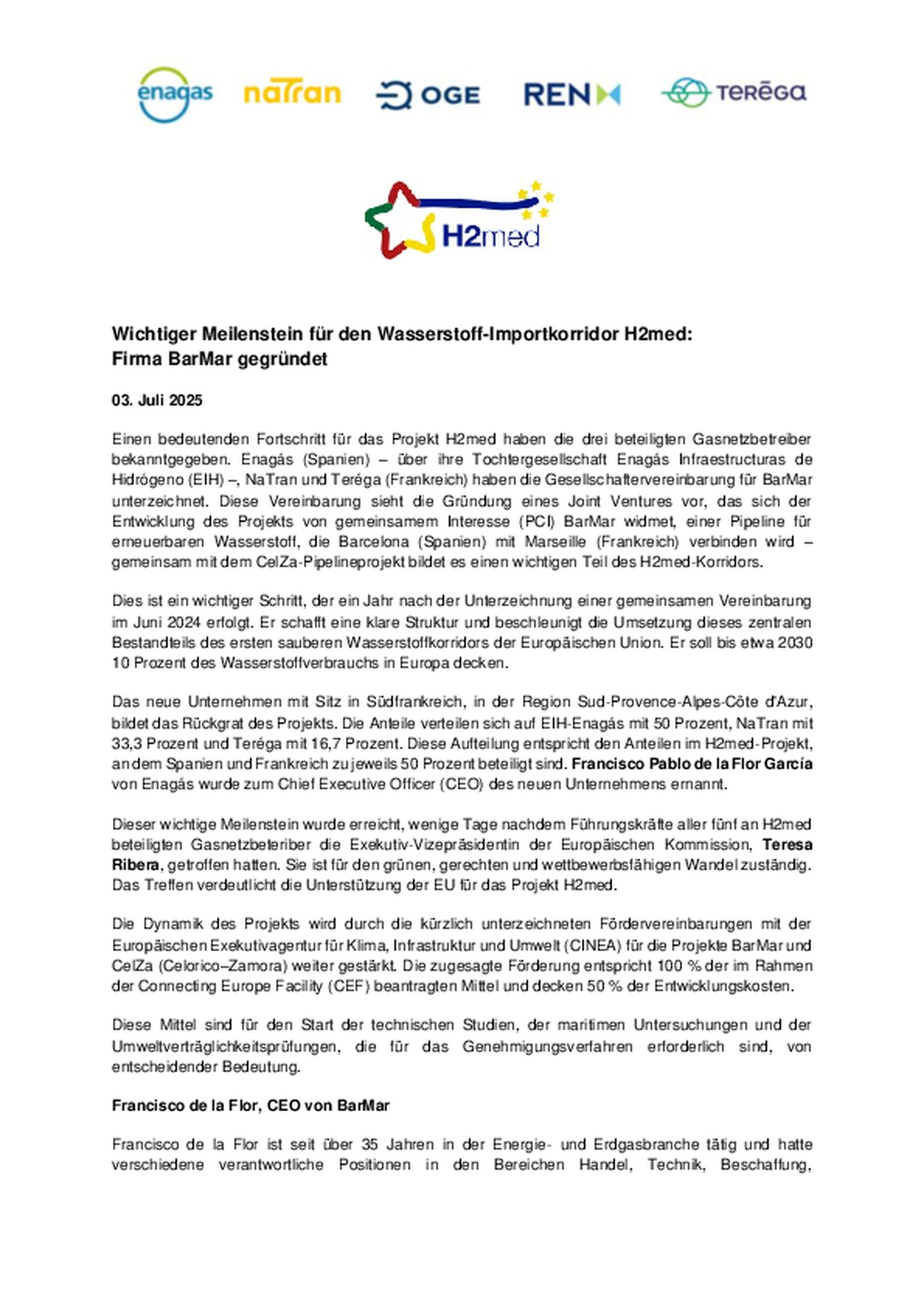 Einen bedeutenden Fortschritt für das Projekt H2med haben die drei beteiligten Gasnetzbetreiber bekanntgegeben. Enagás (Spanien) – über ihre Tochtergesellschaft Enagás Infraestructuras de Hidrógeno …(EIH) –, NaTran und Teréga (Frankreich) haben die Gesellschaftervereinbarung für BarMar unterzeichnet.