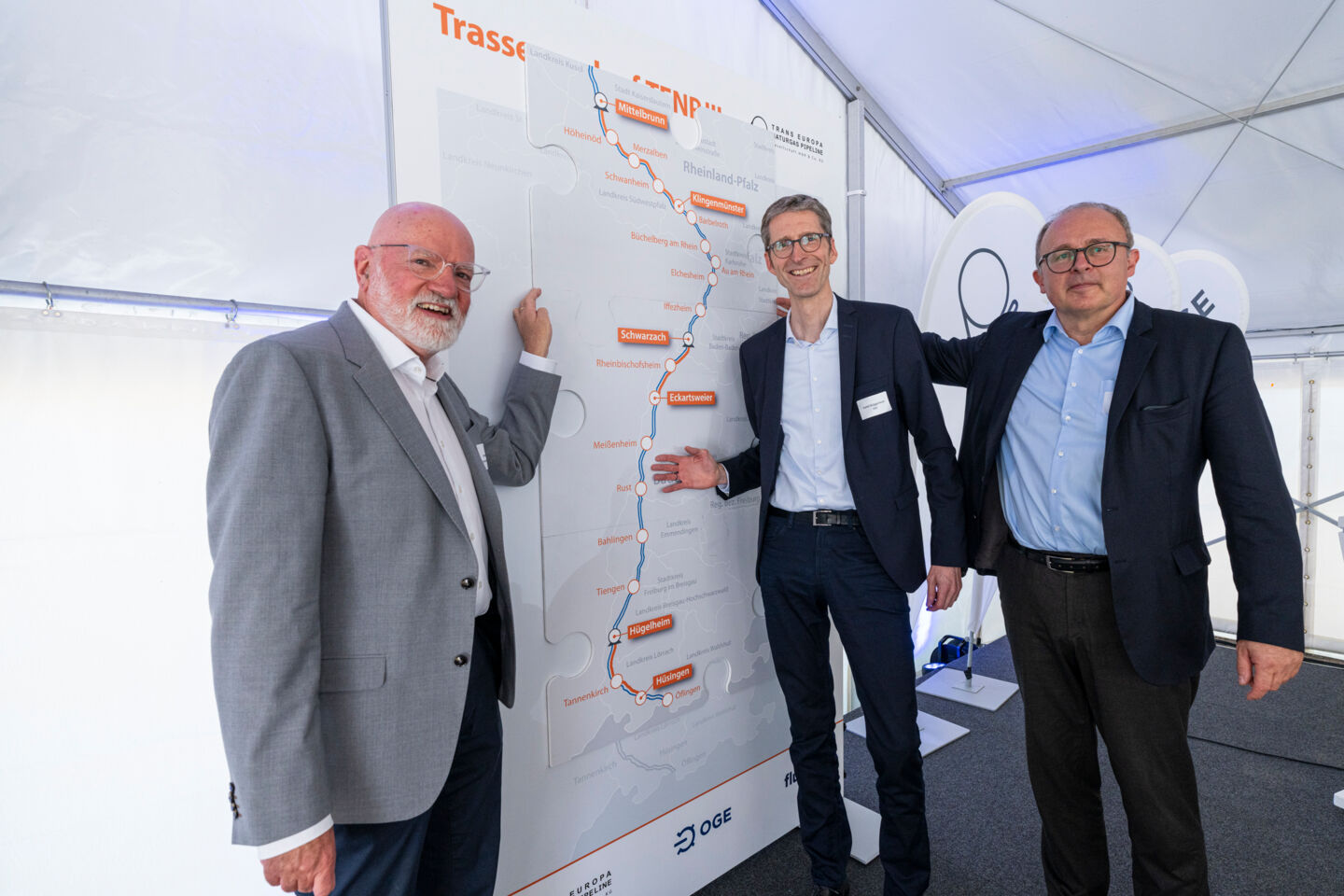 Setzten die drei Bauabschnitte der TENP III symbolisch zusammen (v. l. n. r.): Klemens Ficht (Regierungsvizepräsident Freiburg), Detlef Brüggemeyer (Geschäftsführung OGE), Gérard Kimus …(Geschäftsführung Fluxys TENP).