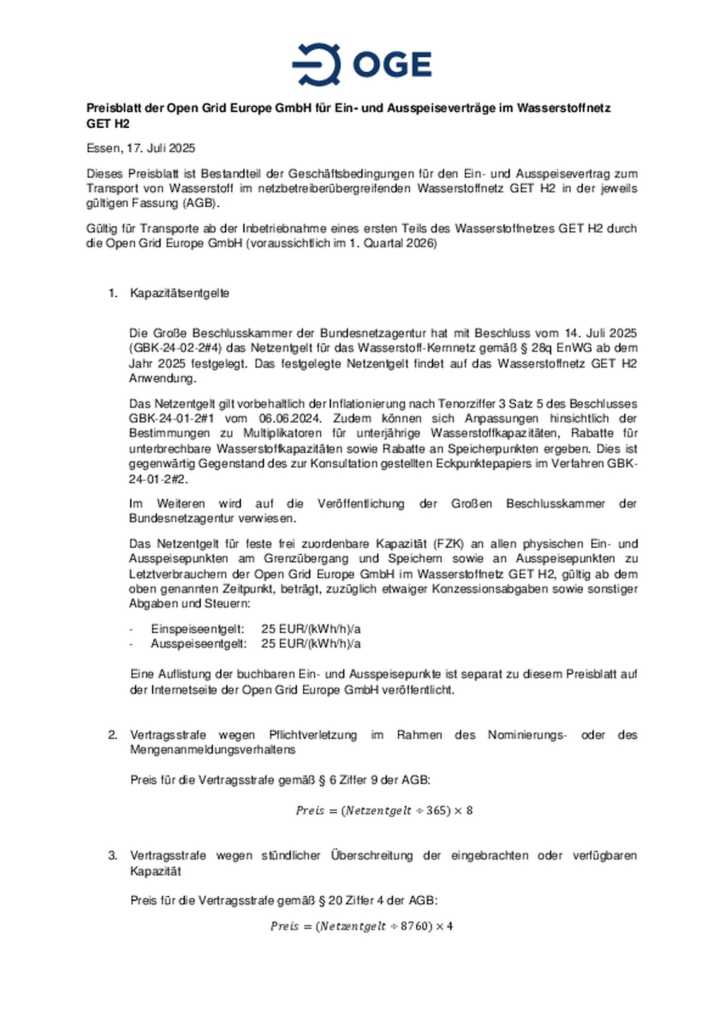 Dieses Preisblatt ist Bestandteil der Geschäftsbedingungen für den Ein- und Ausspeisevertrag zum Transport von Wasserstoff im netzbetreiberübergreifenden Wasserstoffnetz GET H2 in der …jeweils gültigen Fassung (AGB). Gültig für Transporte ab der Inbetriebnahme eines ersten Teils des Wasserstoffnetzes GET H2 durch die Open Grid Europe GmbH (voraussichtlich im 1. Quartal 2026). Stand 17. Juli 2025