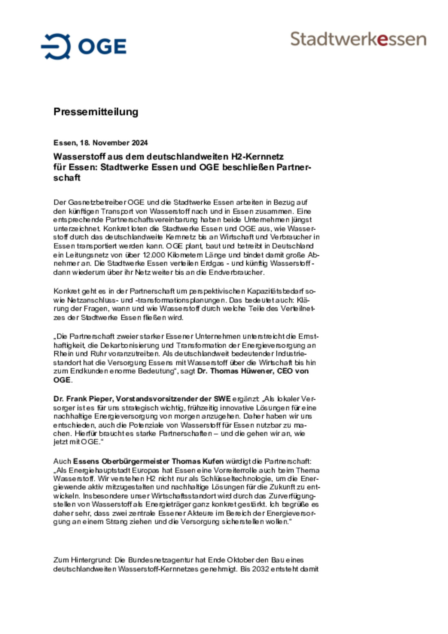 Wasserstoff aus dem deutschlandweiten H2-Kernnetz für Essen: Stadtwerke Essen und OGE beschließen Partnerschaft