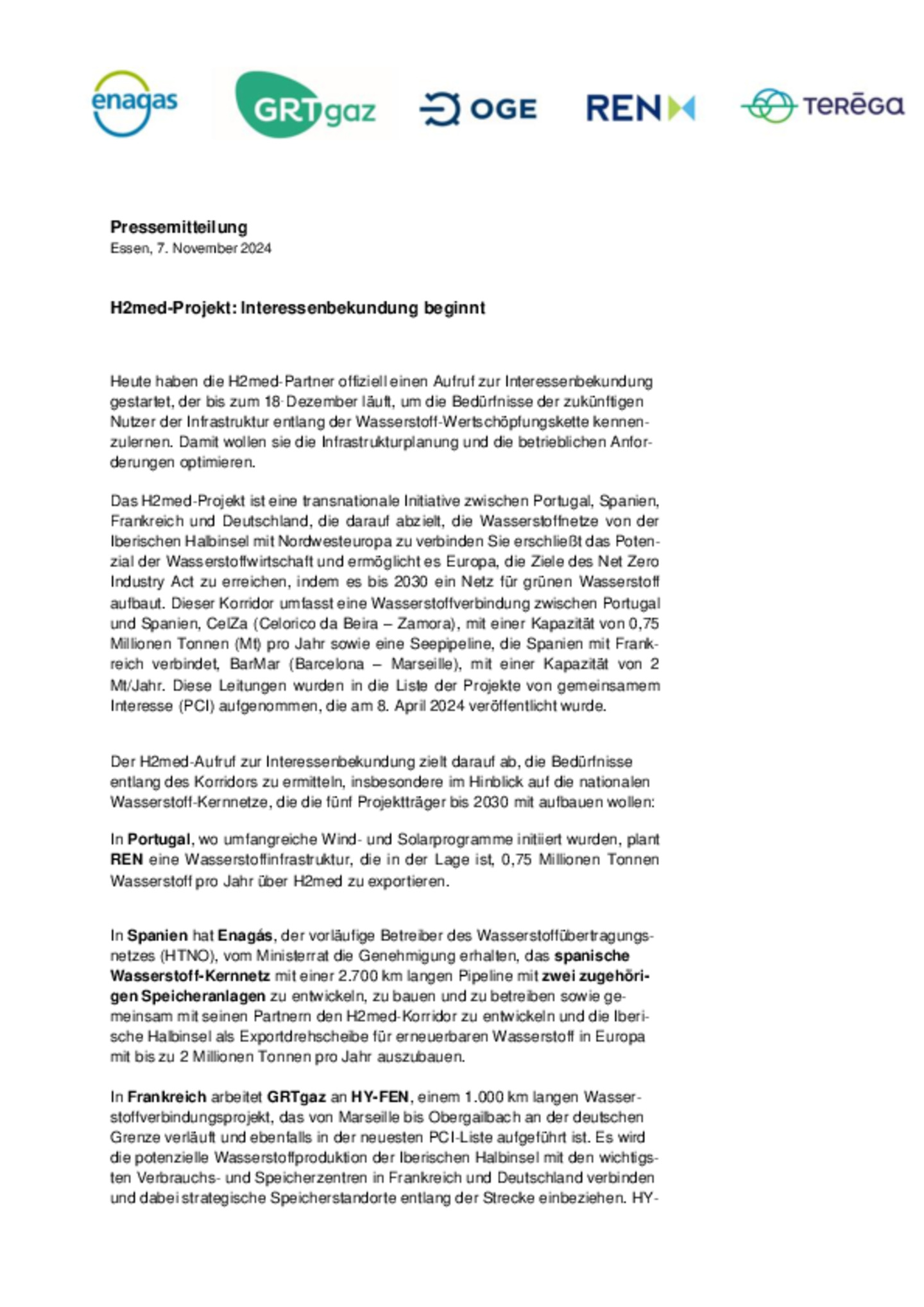 Heute haben die H2med-Partner offiziell einen Aufruf zur Interessenbekundung gestartet, der bis zum 18. Dezember läuft, um die Bedürfnisse der zukünftigen Nutzer der Infrastruktur entlang der …Wasserstoff-Wertschöpfungskette kennenzulernen. Damit wollen sie die Infrastrukturplanung und die betrieblichen Anforderungen optimieren.