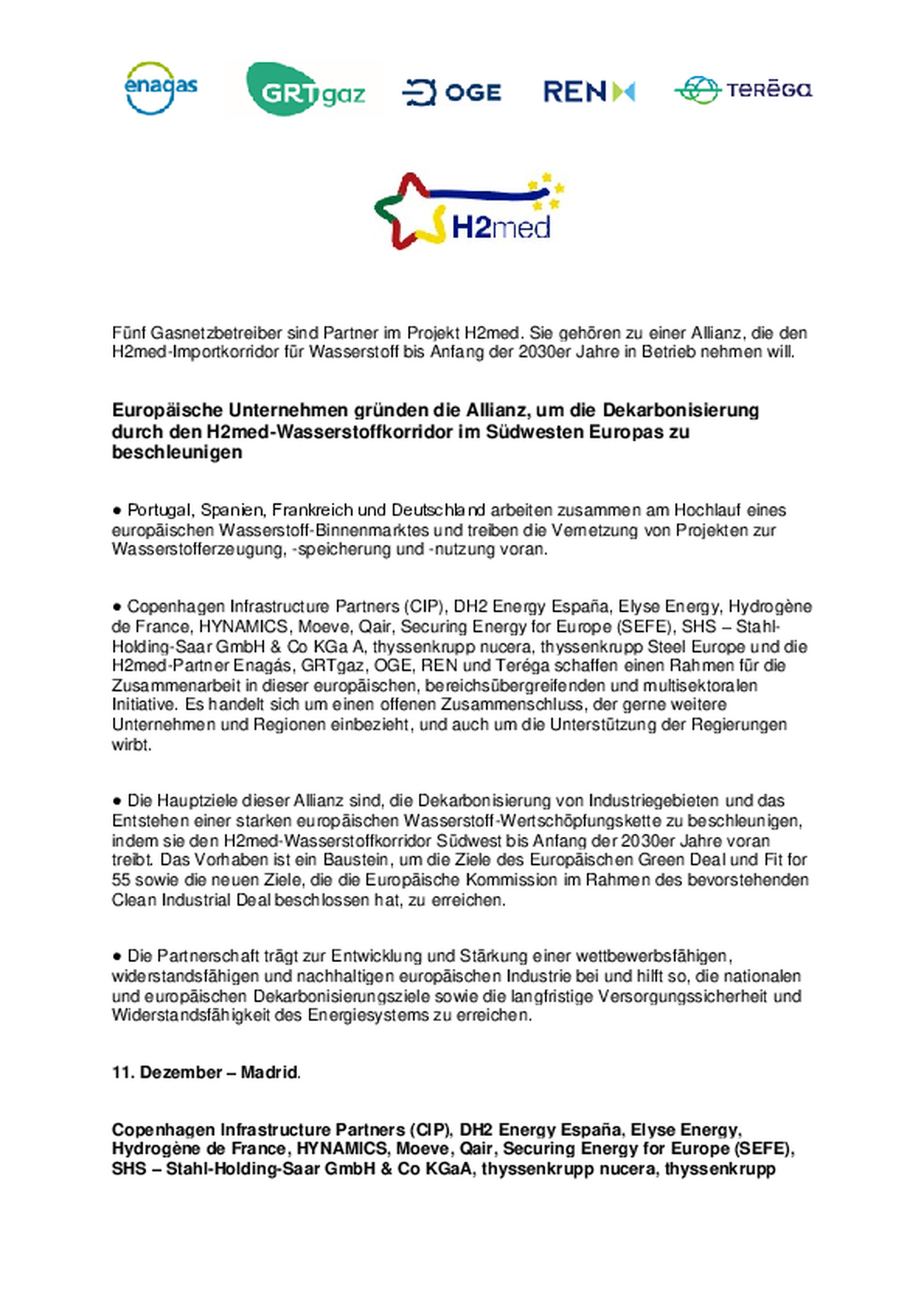 Europäische Unternehmen gründen die Allianz, um die Dekarbonisierung durch den H2med-Wasserstoffkorridor im Südwesten Europas zu beschleunigen