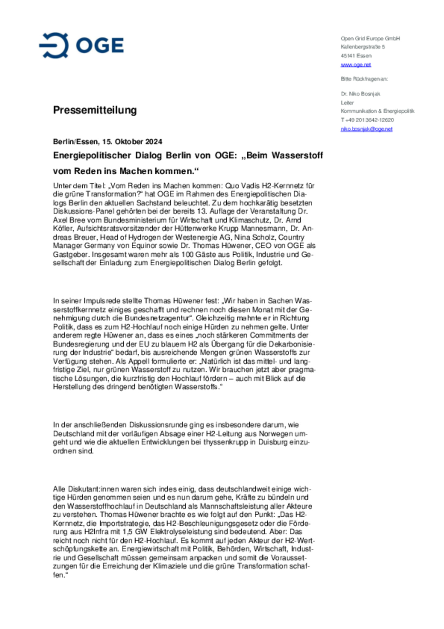Pressefoto: Energiepolitischer Dialog Berlin von OGE: „Beim Wasserstoff vom Reden ins Machen kommen.“