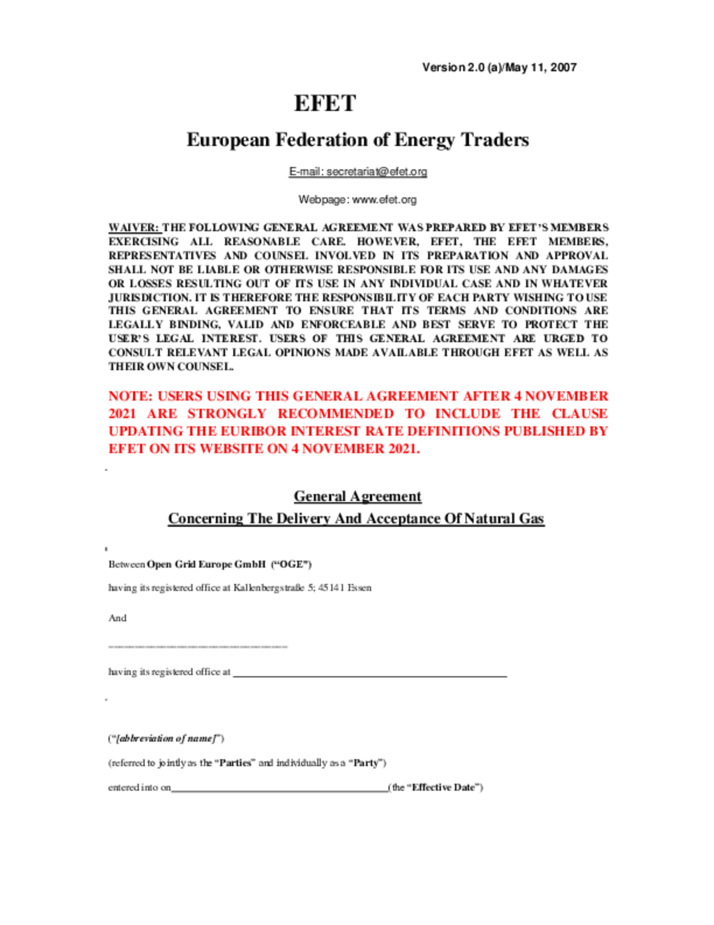 Die Akzeptanz der Regelungen des OGE EFET Vertrages und der Regelungen im Dokument „OGE Verbrauchsgasausschreibung 2026“ sind Voraussetzung für die Aufnahme in das Anbieterverzeichnis und für eine etwaige Berücksichtigung der Angebote der potenziellen Lieferanten. Der bzw. die Einzelverträge auf Basis des OGE EFET Vertrages werden, sofern ein Zuschlag seitens OGE erteilt wurde, im Anschluss zeitnah abgeschlossen.