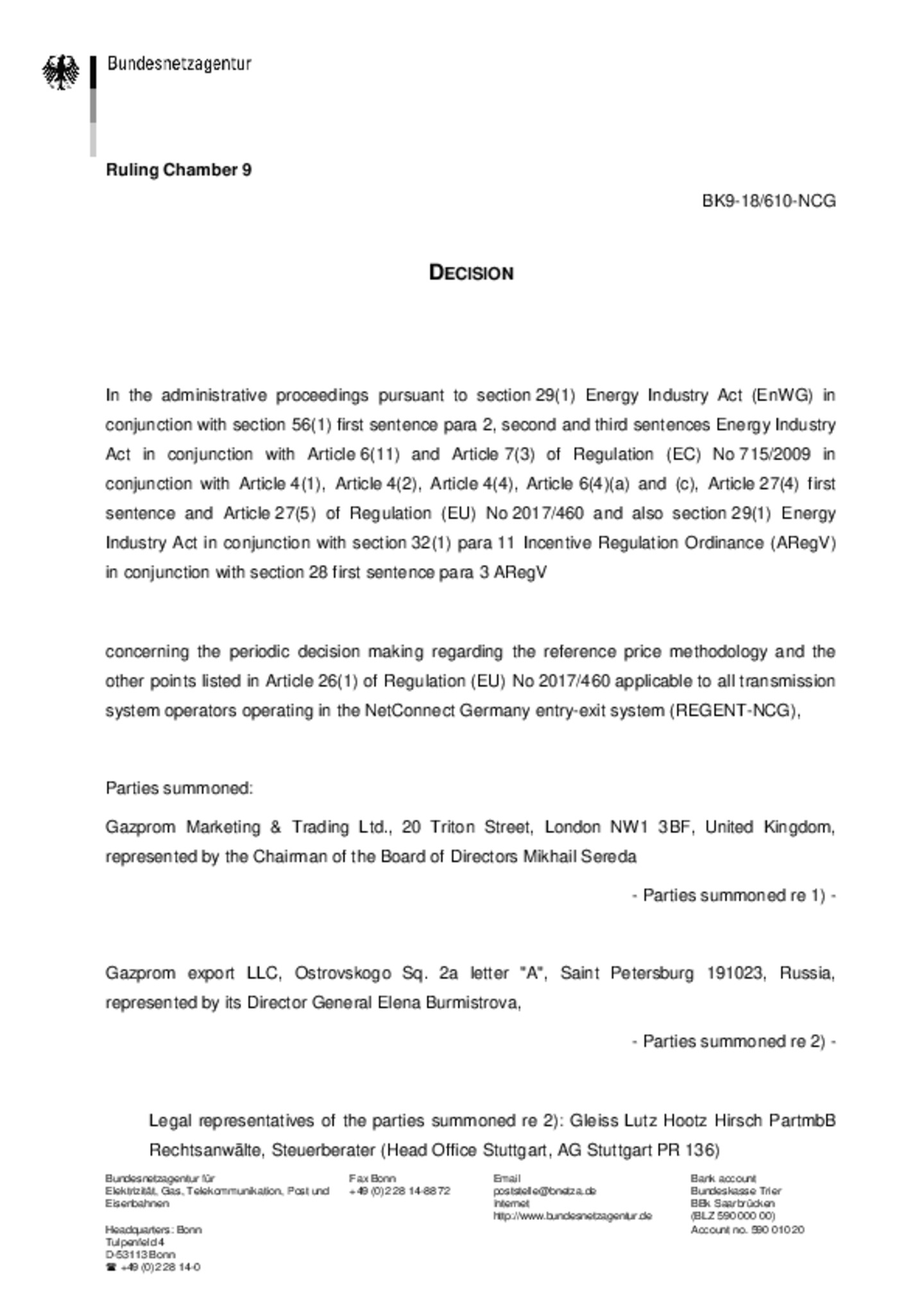 In conjunction with Art. 26 NC TAR consultation, the cost allocation test was carried out by the BNetzA. The test results, including an assessment, are published on the website of the Federal Network Agency via REGENT for the market area Trading Hub Europe (BK9-19/610) entry-exit system.