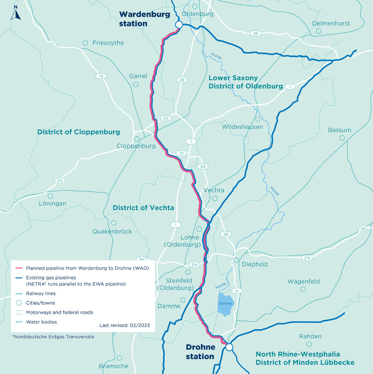 Like the Etzel-Wardenburg section, the pipeline leg from Wardenburg to Drohne will support the NETRA (Norddeutsche Erdgas-Transversale) gas transmission pipeline, which has been in operation since 1995, transferring natural gas from the Netherlands, Norway and Wilhelmshaven into the German gas transmission pipeline system. The Wardenburg-Drohne (WAD) section has also been designed to transport hydrogen. In addition, it is helping to deliver a pilot project, being the first pipeline to use carbon-reduced pipes on one stretch of the 90 km pipeline.