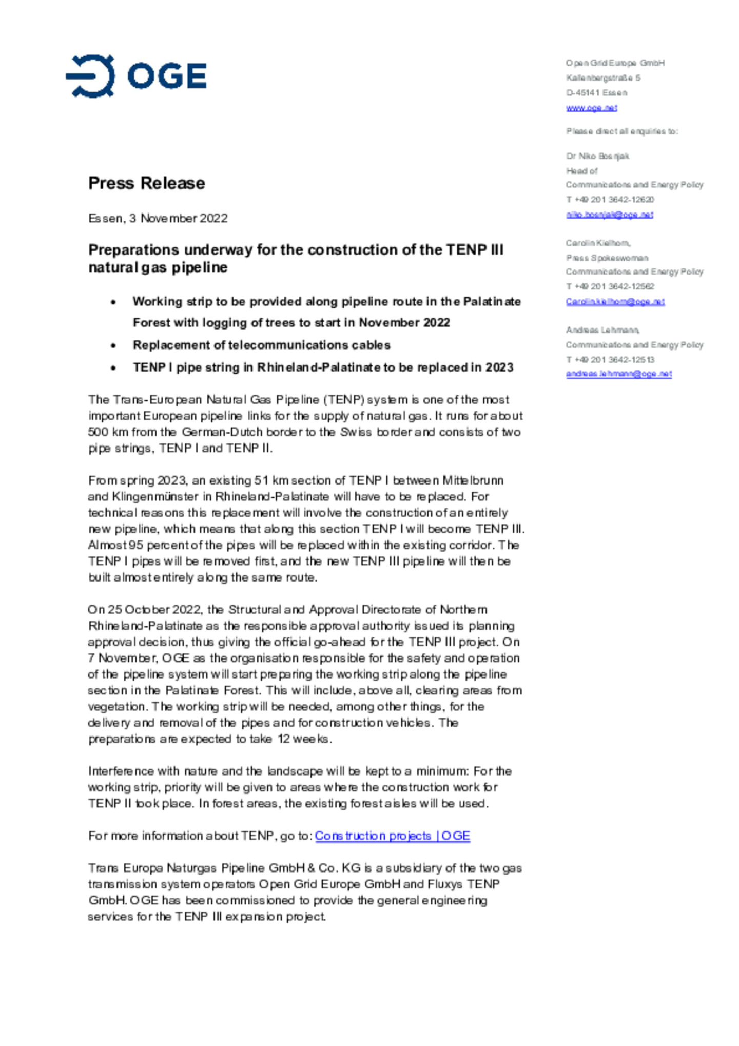 Working strip to be provided along pipeline route in the Palatinate Forest with logging of trees to start in November 2022. Replacement of telecommunications cables. TENP I pipe string in …Rhineland-Palatinate to be replaced in 2023.