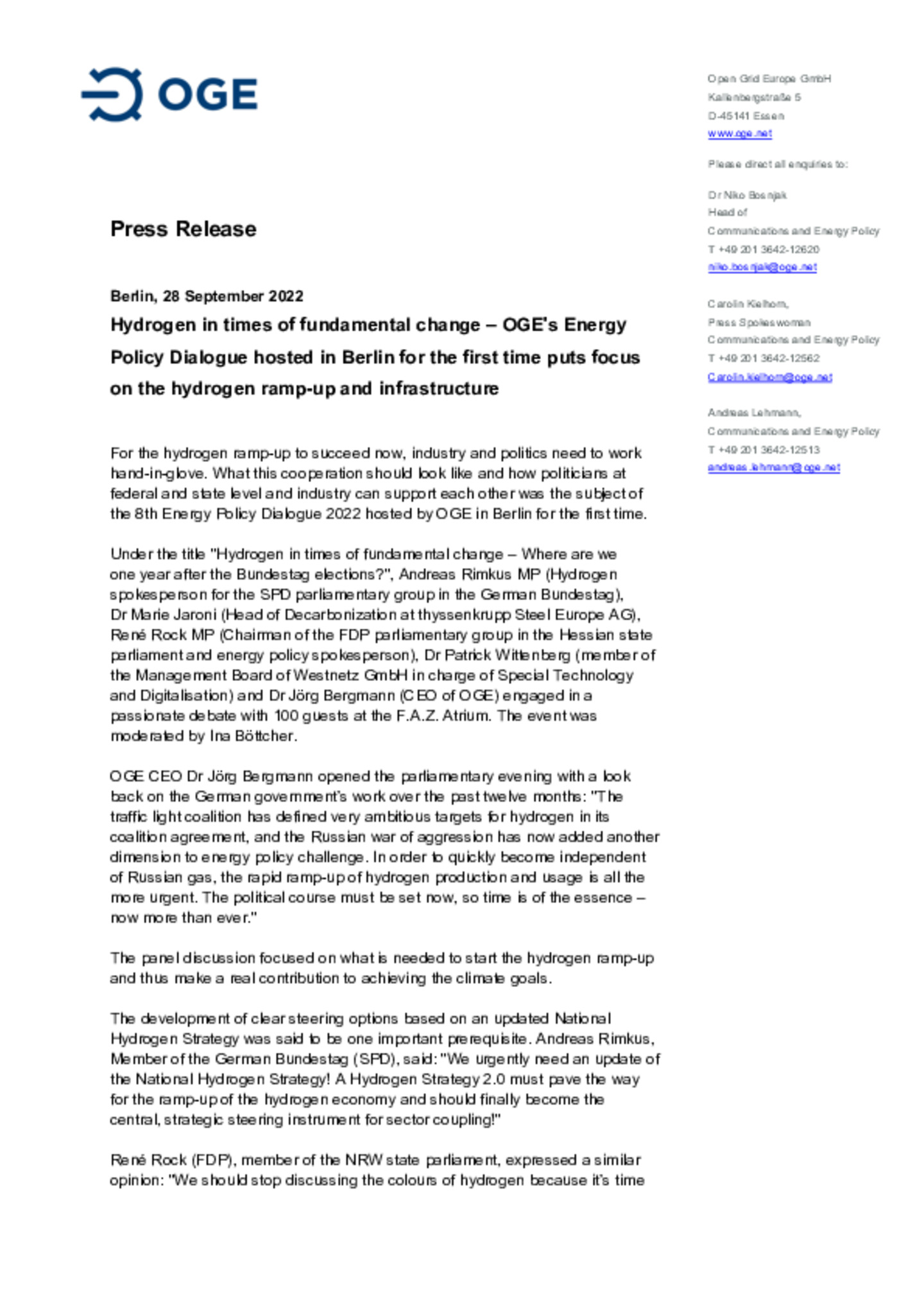 Hydrogen in times of fundamental change – OGE's Energy Policy Dialogue hosted in Berlin for the first time puts focus on the hydrogen ramp-up and infrastructure