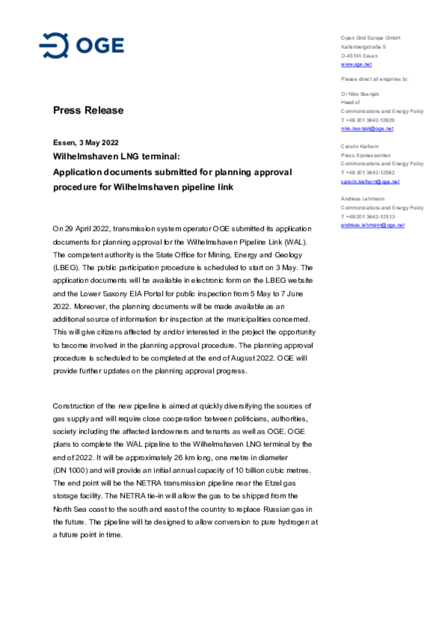 On 30 November 2021, OGE applied to the Federal Network Agency (BNetzA) for the introduction of competitive capacity marketing for conditionally firm freely allocable capacities (bFZK) at selected …storage connection points.