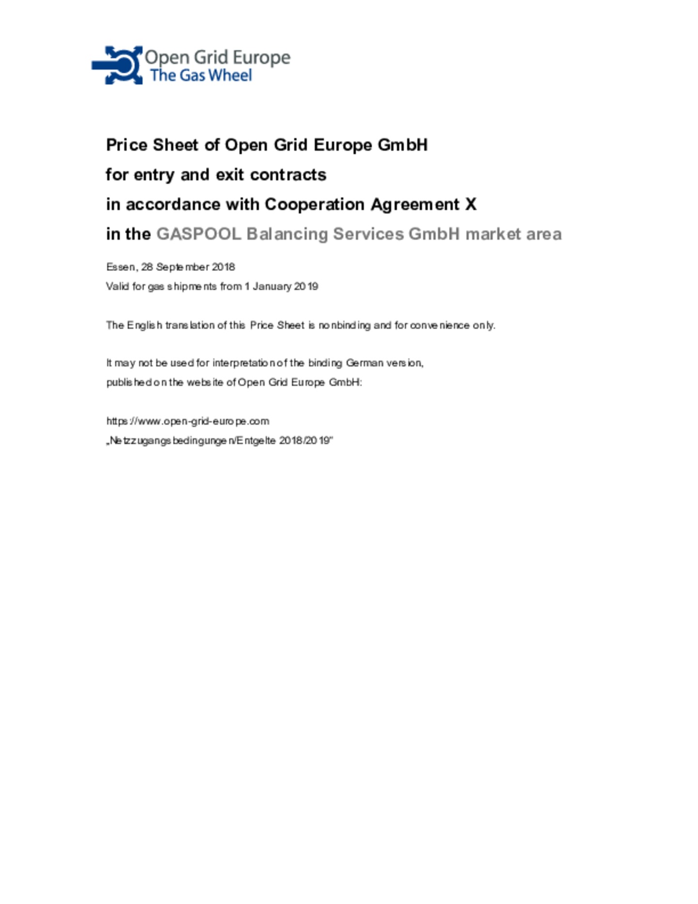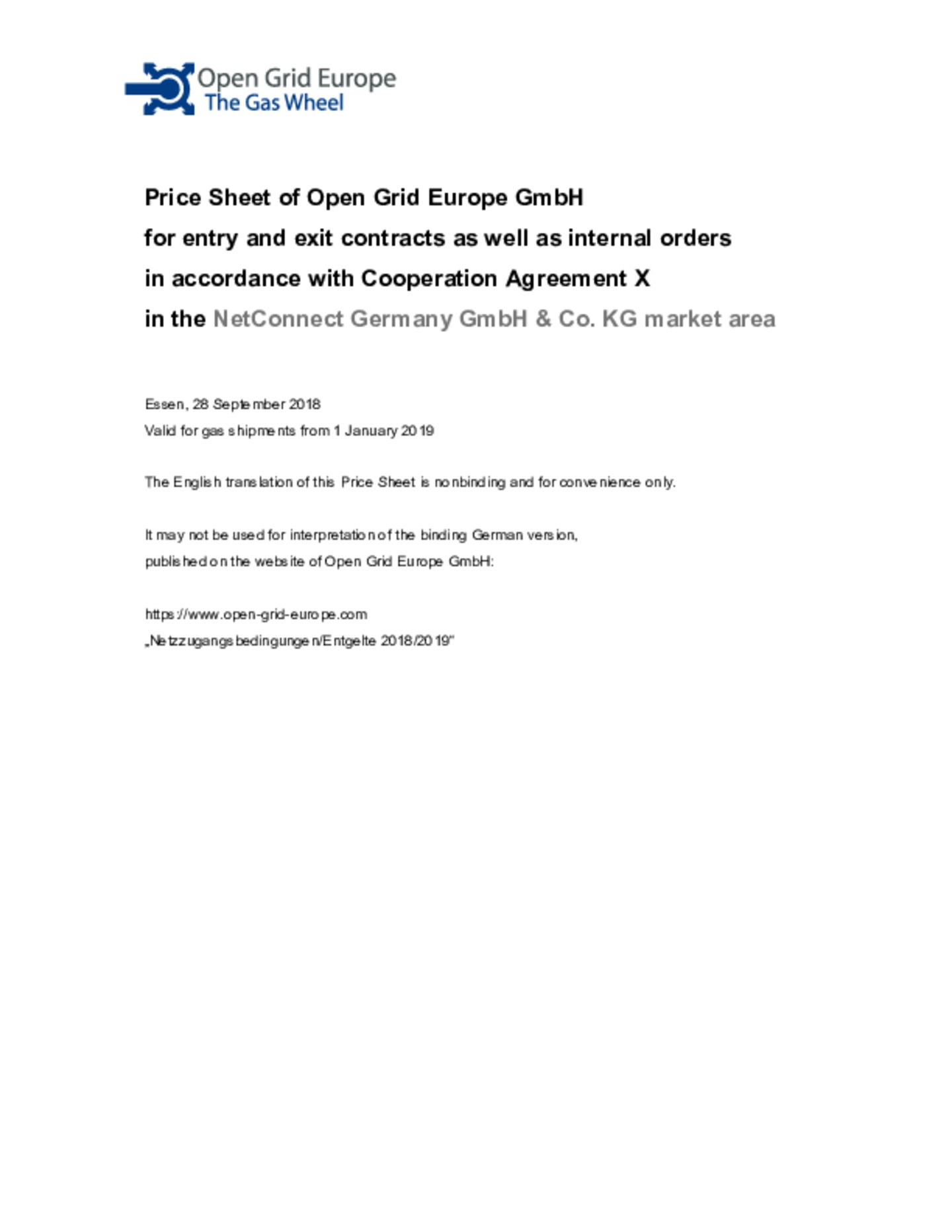 NCG Price sheet of Open Grid Europe GmbH 2019