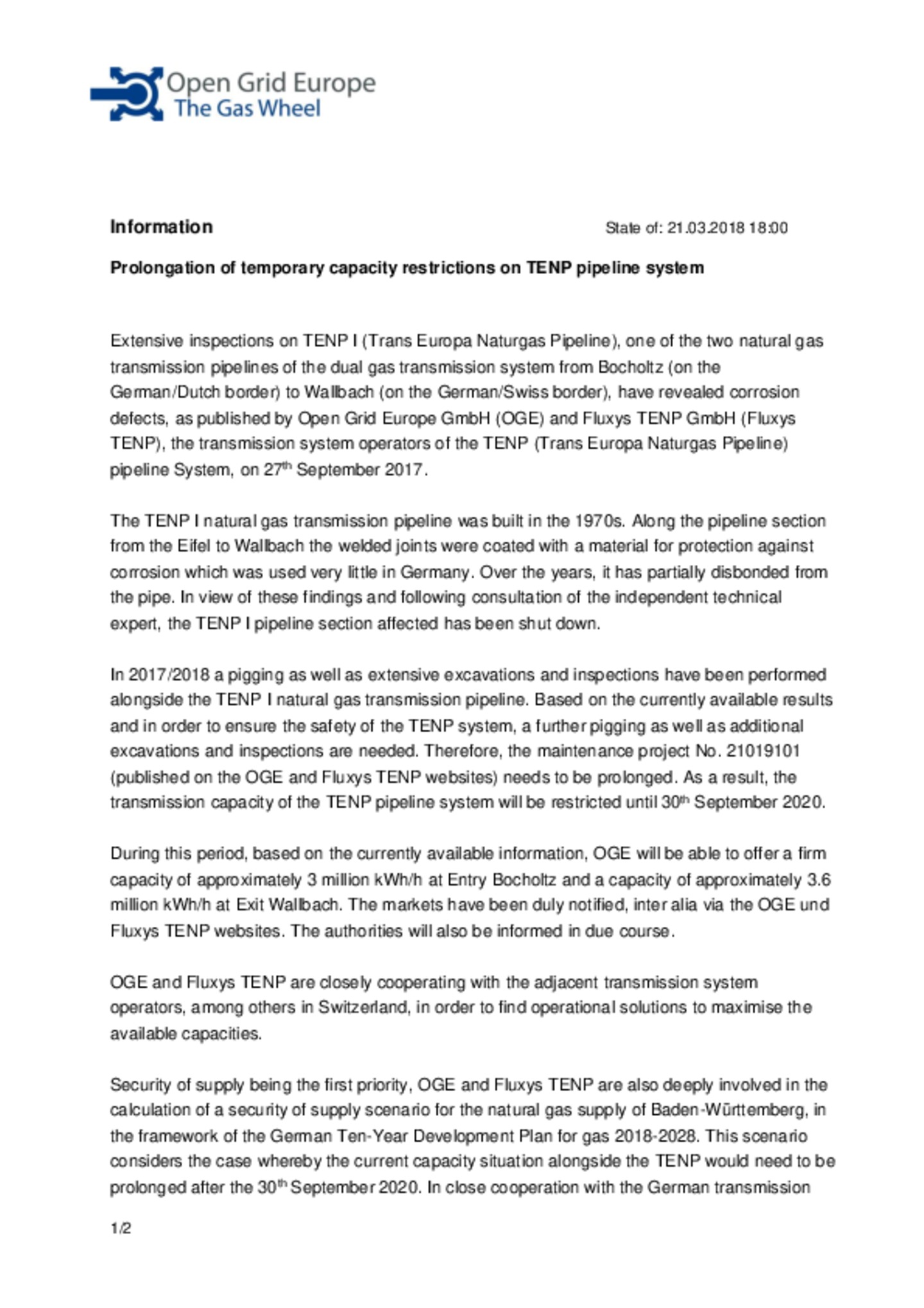 NCG Price sheet of Open Grid Europe GmbH 2018