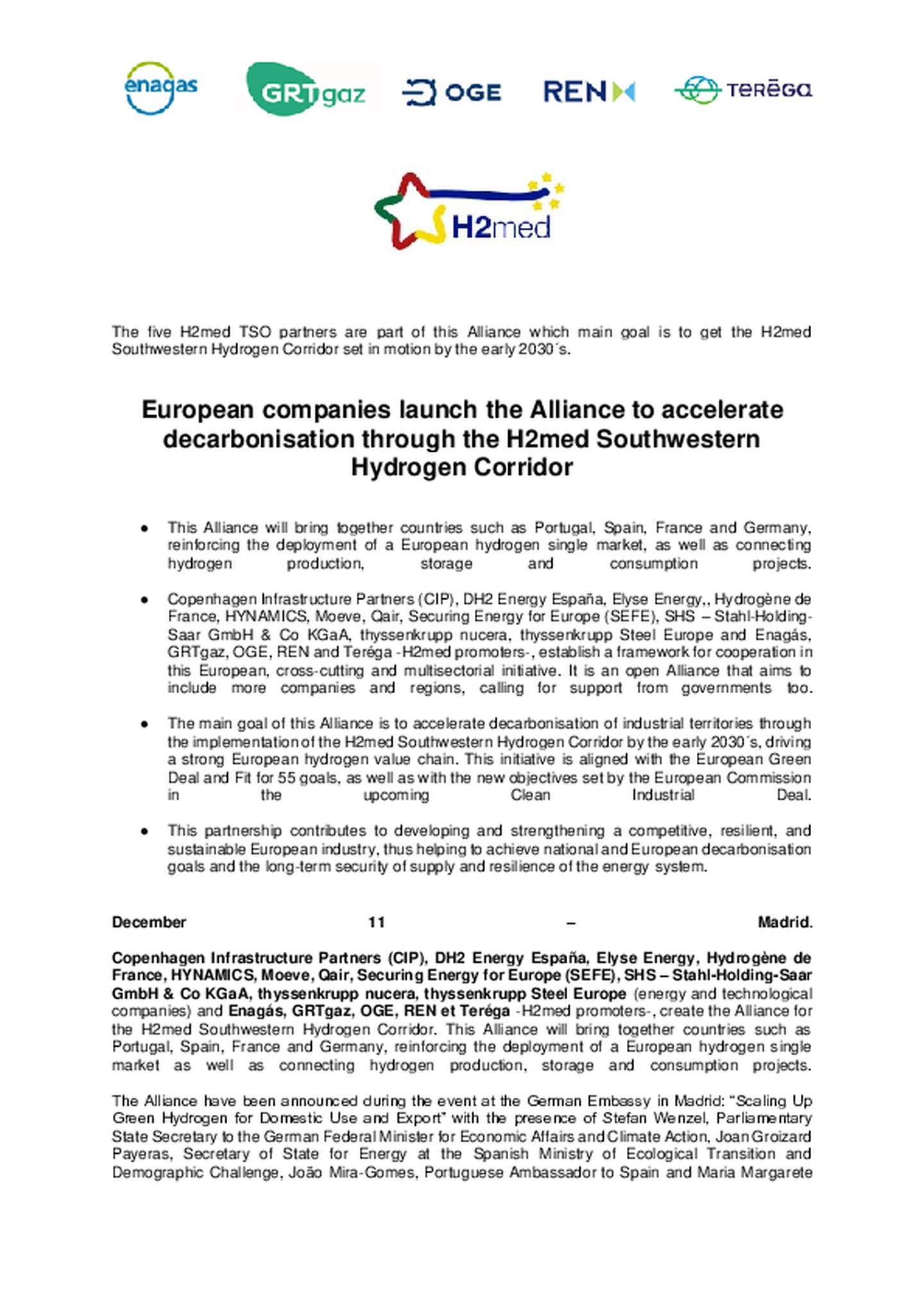 Press photo: European companies launch the Alliance to accelerate decarbonisation through the H2med Southwestern Hydrogen Corridor