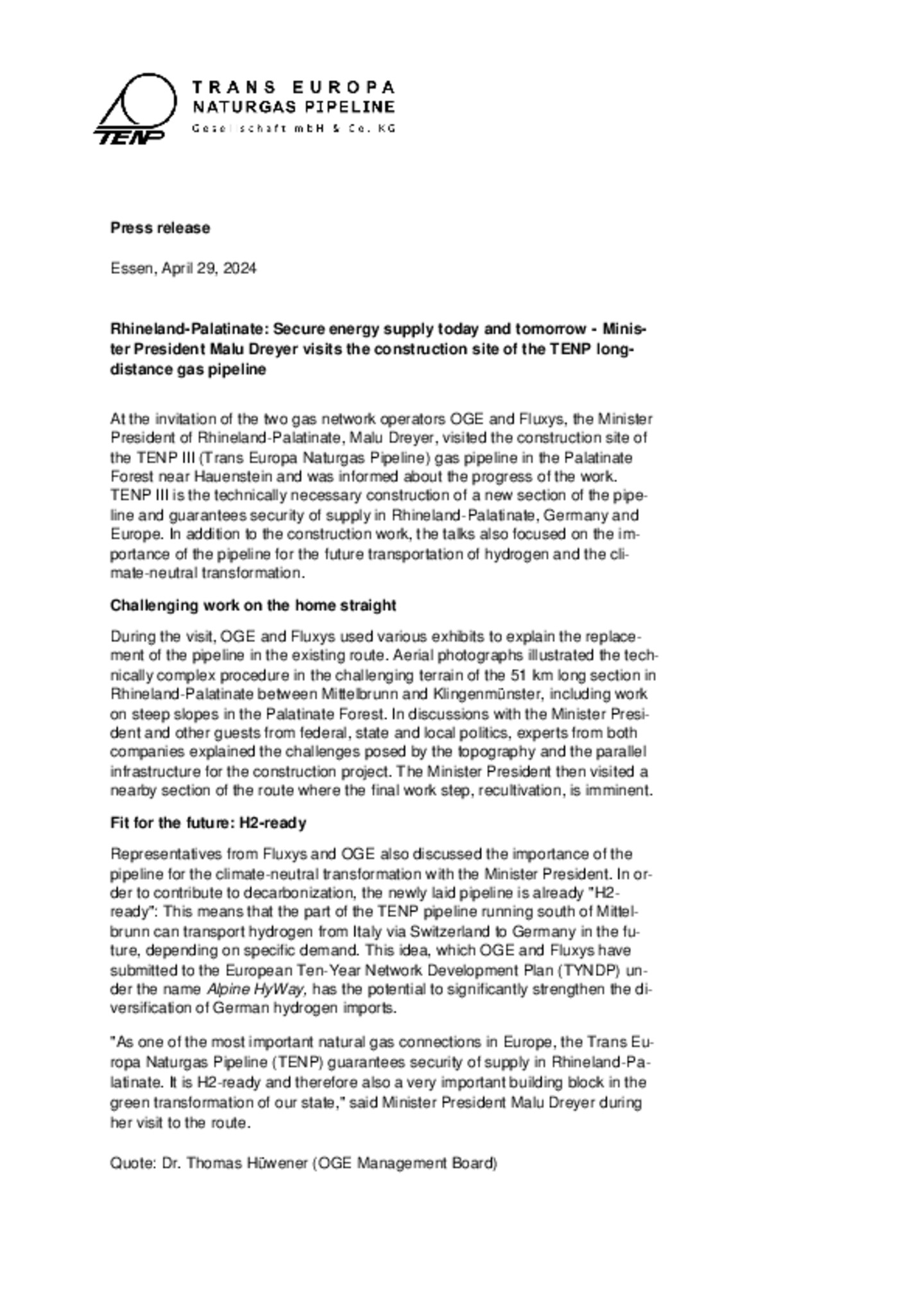 At the invitation of the two gas network operators OGE and Fluxys, the Minister President of Rhineland-Palatinate, Malu Dreyer, visited the construction site of the TENP III (Trans Europa Naturgas …Pipeline) gas pipeline in the Palatinate Forest near Hauenstein and was informed about the progress of the work.