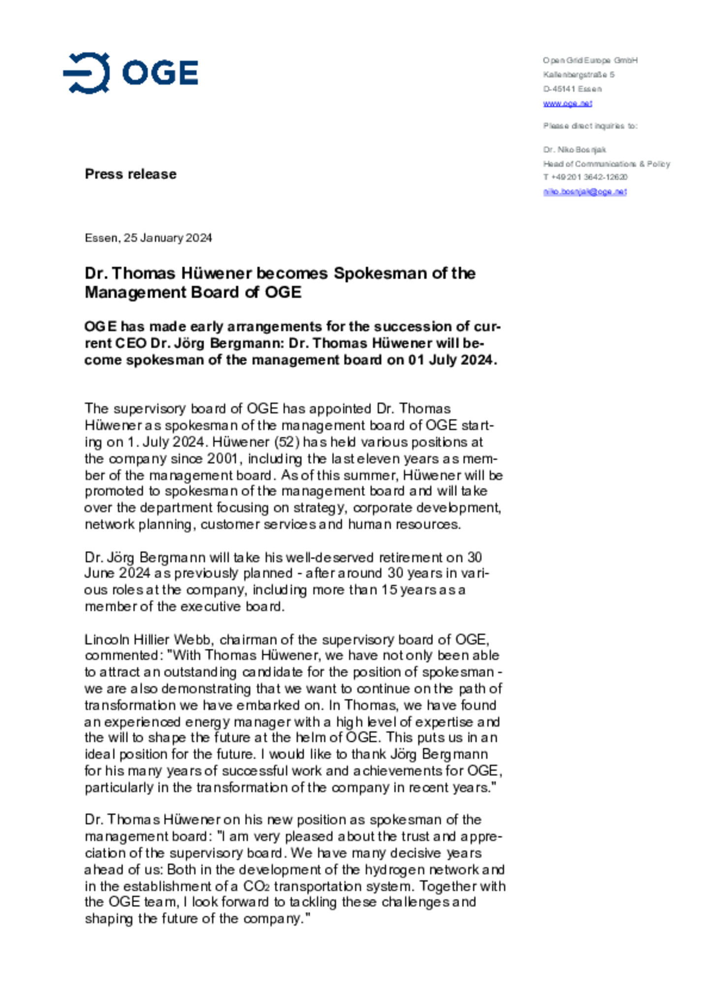OGE has successfully arranged the succession for the position of technical managing director: OGE's Supervisory Board has appointed Detlef Brüggemeyer as a member of OGE's Management Board.