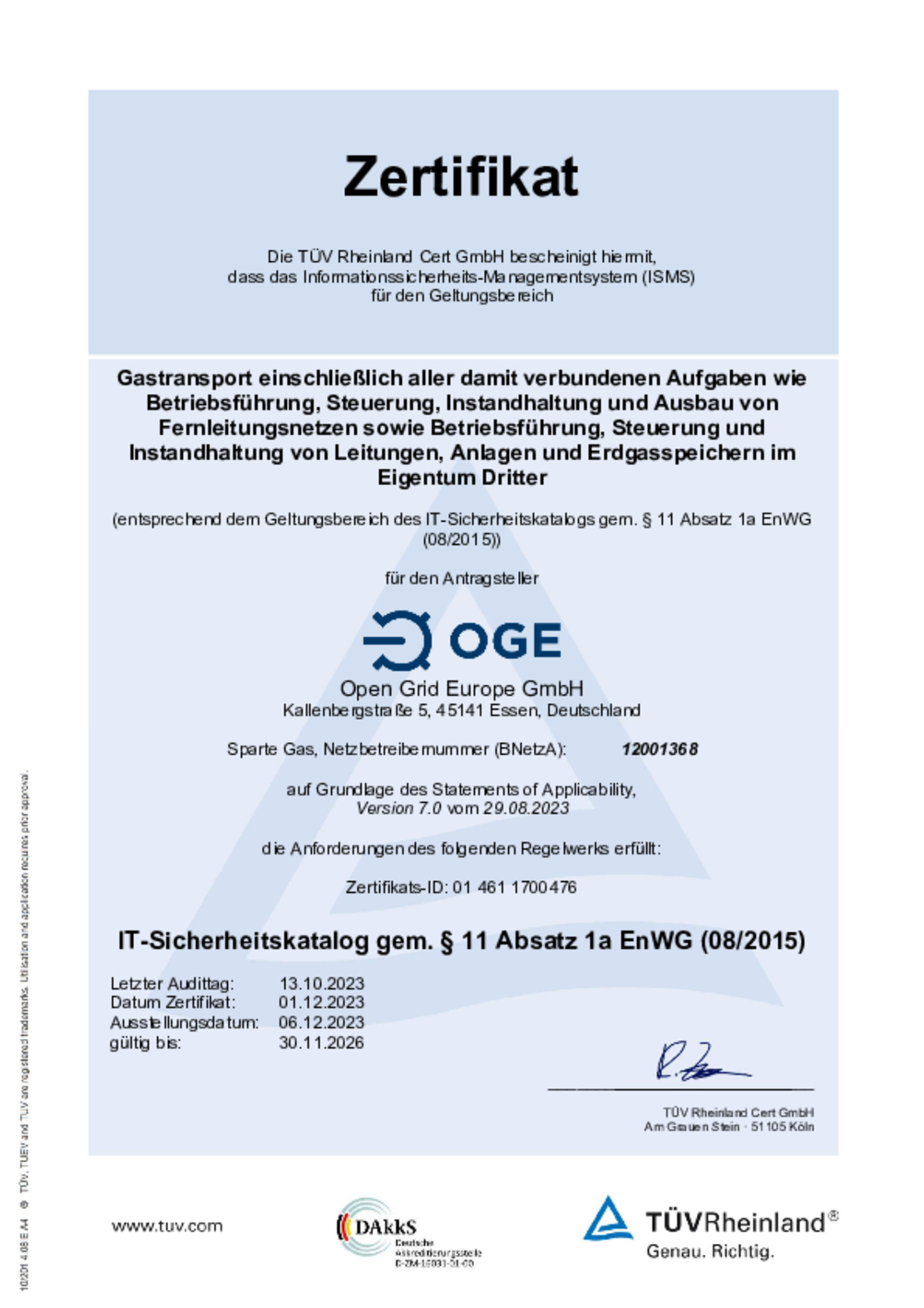 In 2017, TÜV Rheinland, as an accredited body, issued OGE its first certificate confirming the operation of an effective Information Security Management System (ISMS).